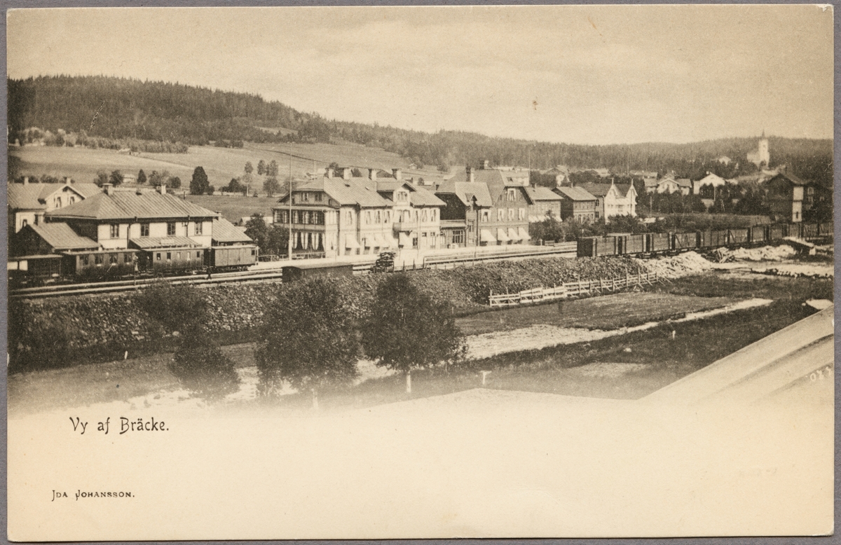 Järnvägsstationen i Bräcke. Till vänster i bild bakom personvagnarna ligger stationshuset och mitt i bild järnvägshotellet.