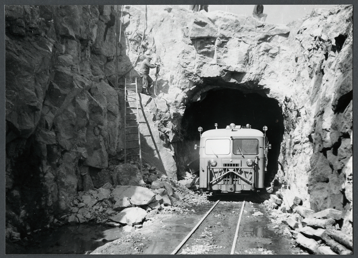 Motortralla, MTR 53p 381 vid Storsjö på linjen mellan Åtvidaberg och Västervik. Tunneln under rivning för breddning av banan till normalspår.
