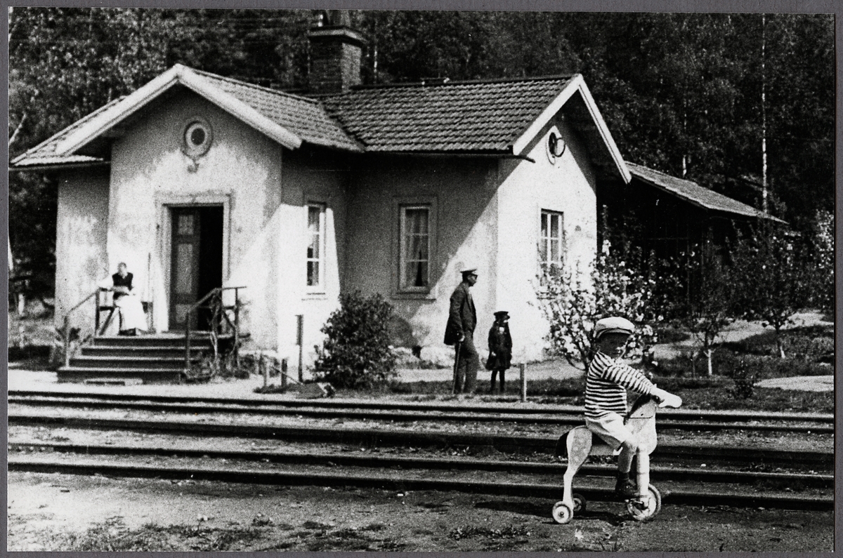 Titel: Familjen Häggström utanför sitt hem vid järnvägen.