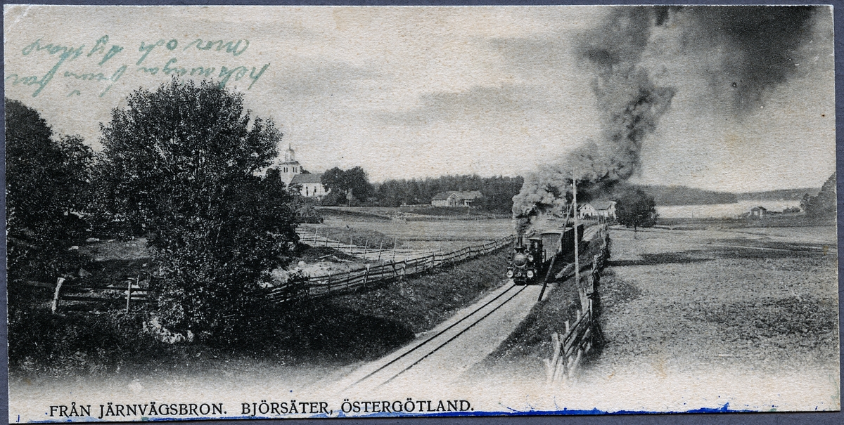 Titel: Persontåg söder om Björsäter med kyrkan i bakgrunden.