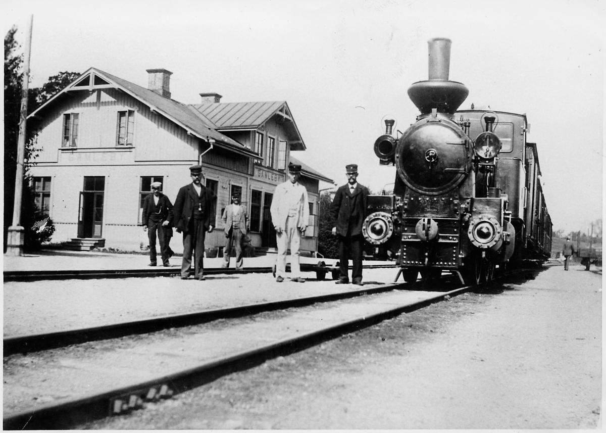Persontåg och personal på bangården vid Gamleby station. WÅB lok 5 "Åtvidaberg", Westervik-Åtvidaberg-Bersbo järnväg.
