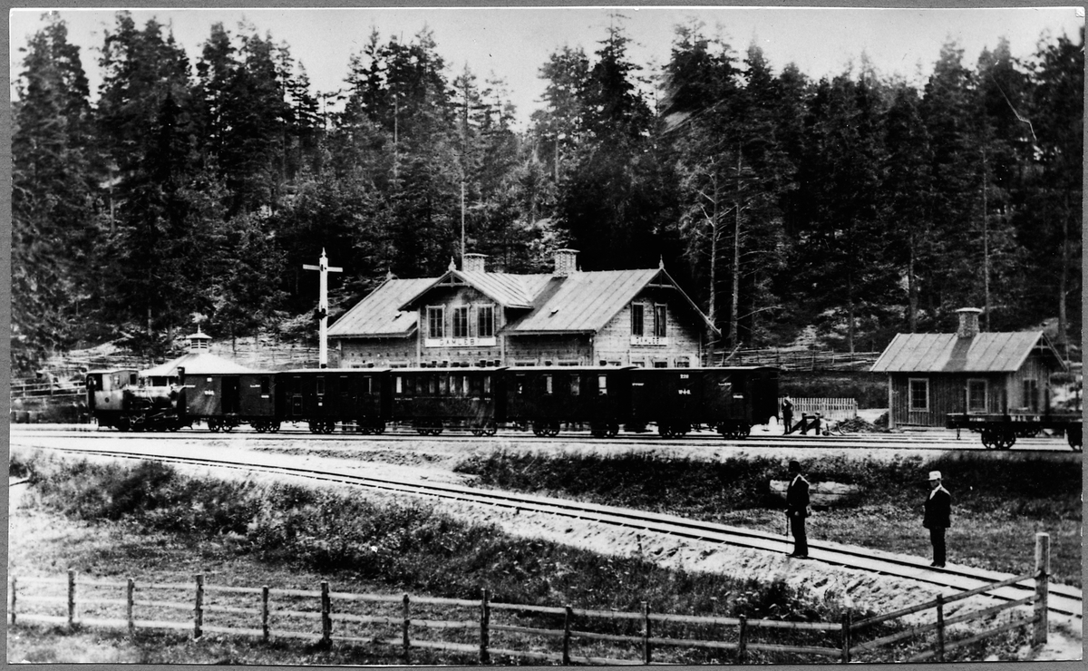 Persontåg vid Gamleby station. Ånglok WÅB lok 2 "Westerwik", Westervik-Åtvidaberg-Bersbo järnväg.