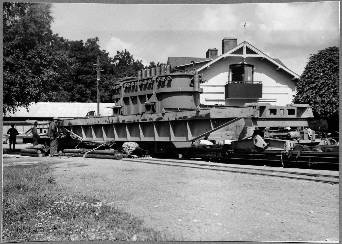 Titel: Transformator lastad på två stycken överföringsvagnar under lossning vid Överums station år 1963.