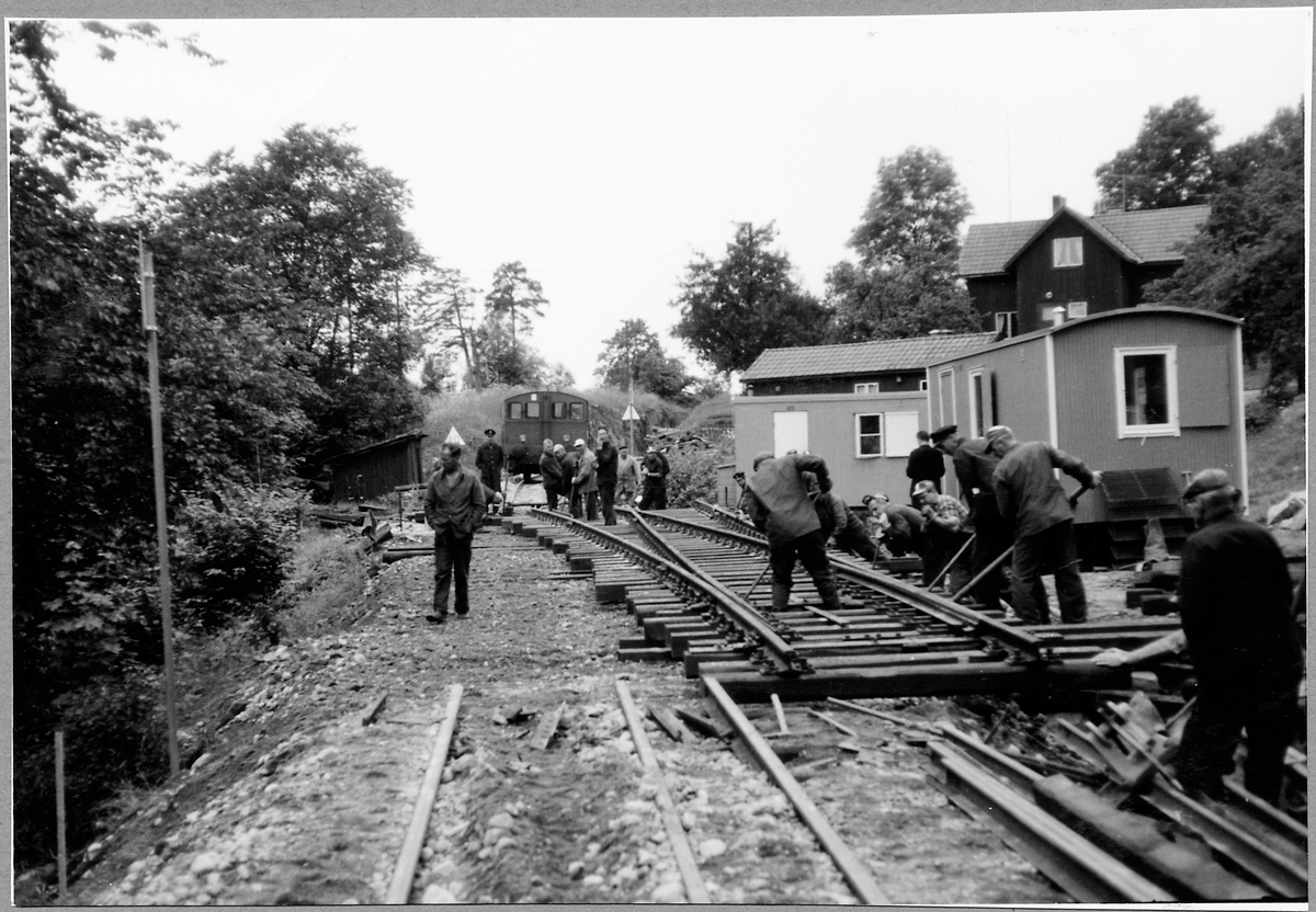 Titel: Vägomläggning och breddning till normalspår vid Överum. Växel vid Överums såg under inläggning.