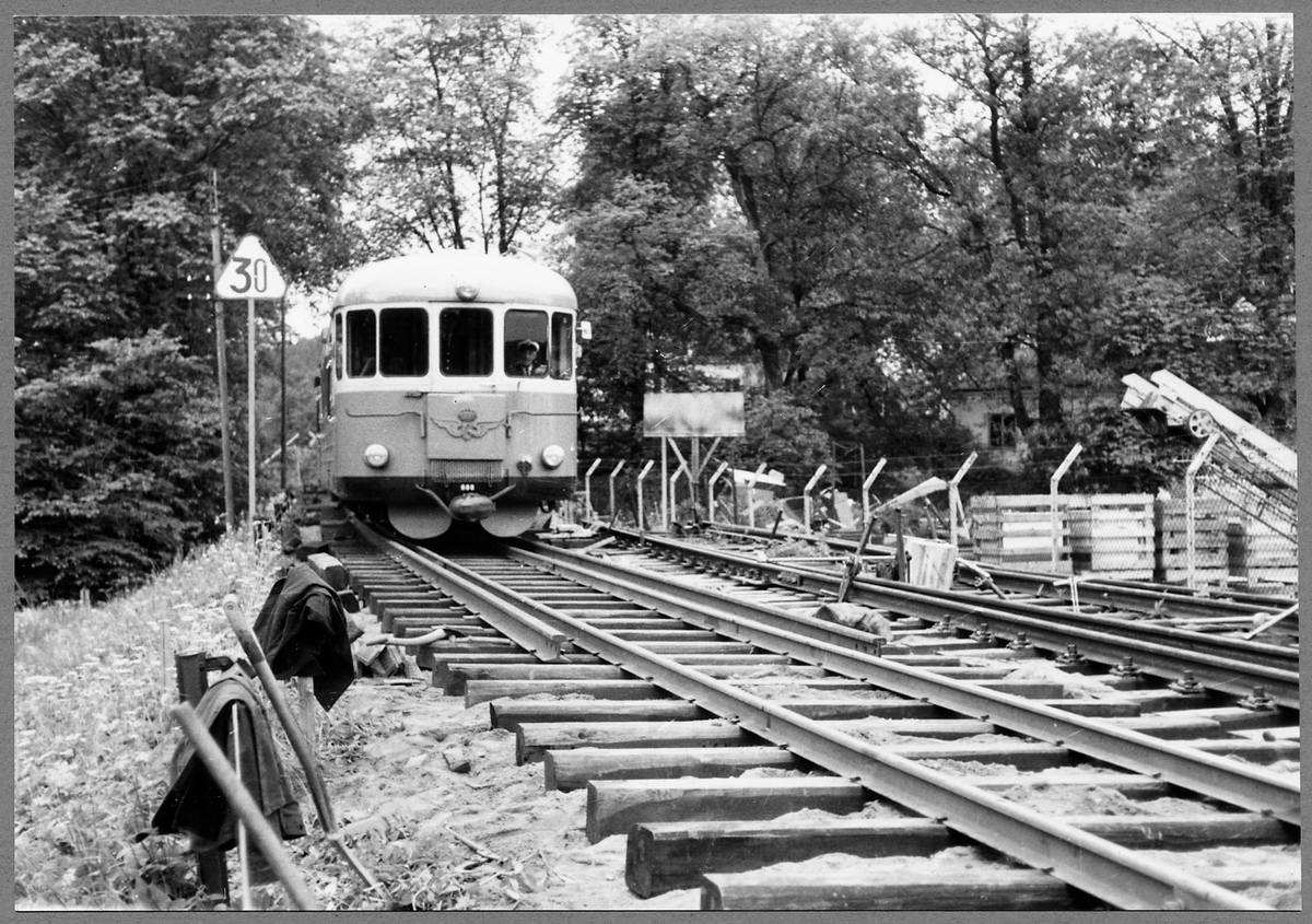 Vägomläggning och breddning till normalspår vid Överum. Persontåget från Norsholm passerar byggarbetsplats.