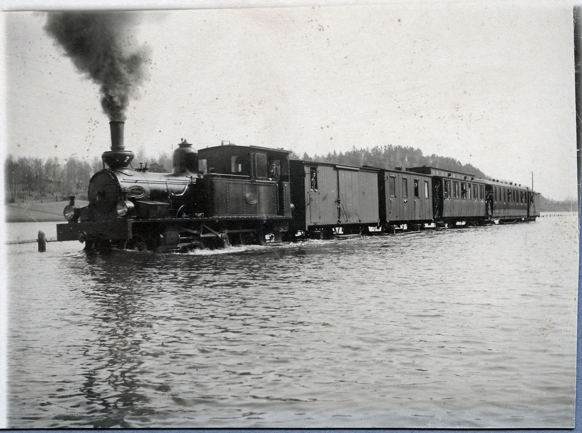 Översvämning i Uknadalen på linjen mellan Storsjö och Nelhammar. Västervik - Åtvidaberg - Bersbo Järnväg, VÅBJ lok 20.