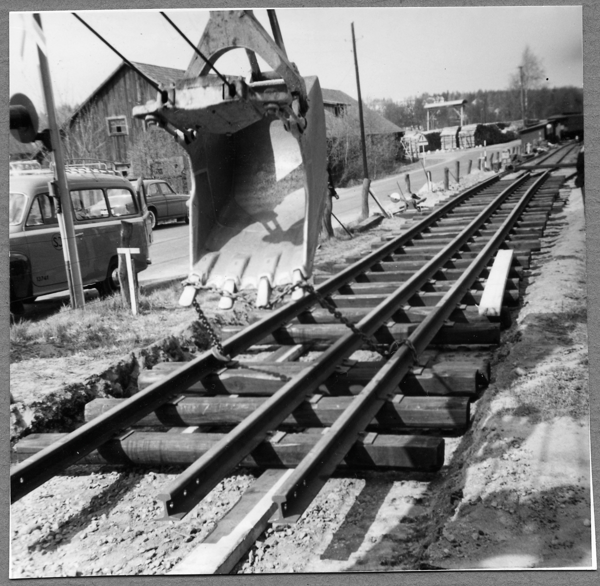 Titel: Första rälslängderna utlägges på linjen Åtvidaberg - Forsaström. Treskensspår. Statens Järnvägar, SJ tjänstebil 13741.