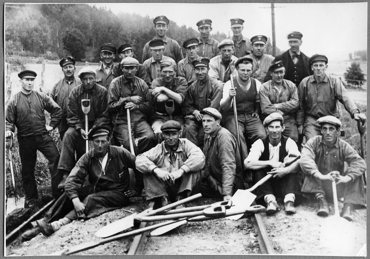 Titel: Banavdelningens arbetslag under rälsbyte i Uknadalen på linjen mellan Storsjö och Nelhammar.