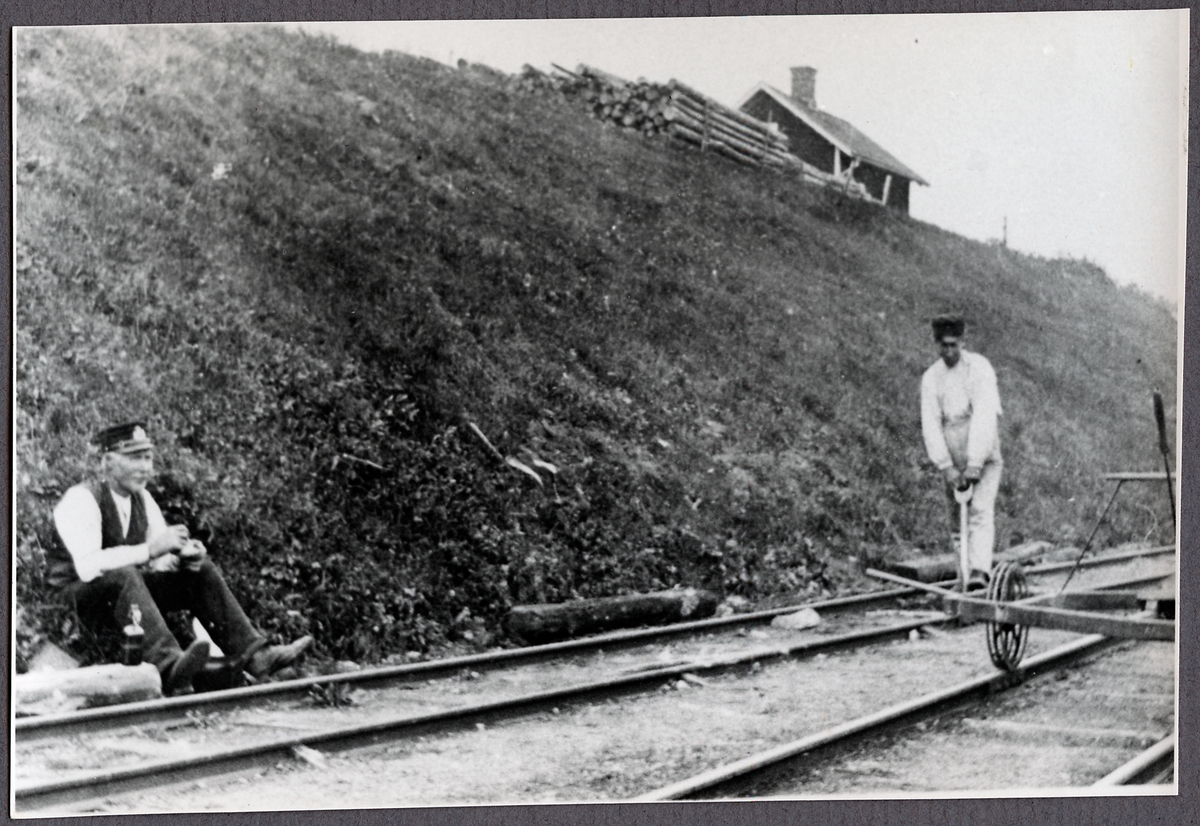Titel: Banvakt Andersson har fikarast medan banarbetare Bäckmark jobbar med sliperinläggning.