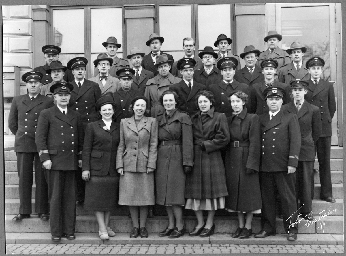 Norsholm - Västervik - Hultsfreds Järnvägar, NVHJ personal vid stationshus i Västervik. Personalen välkomnas till Statens Järnvägar, SJ.