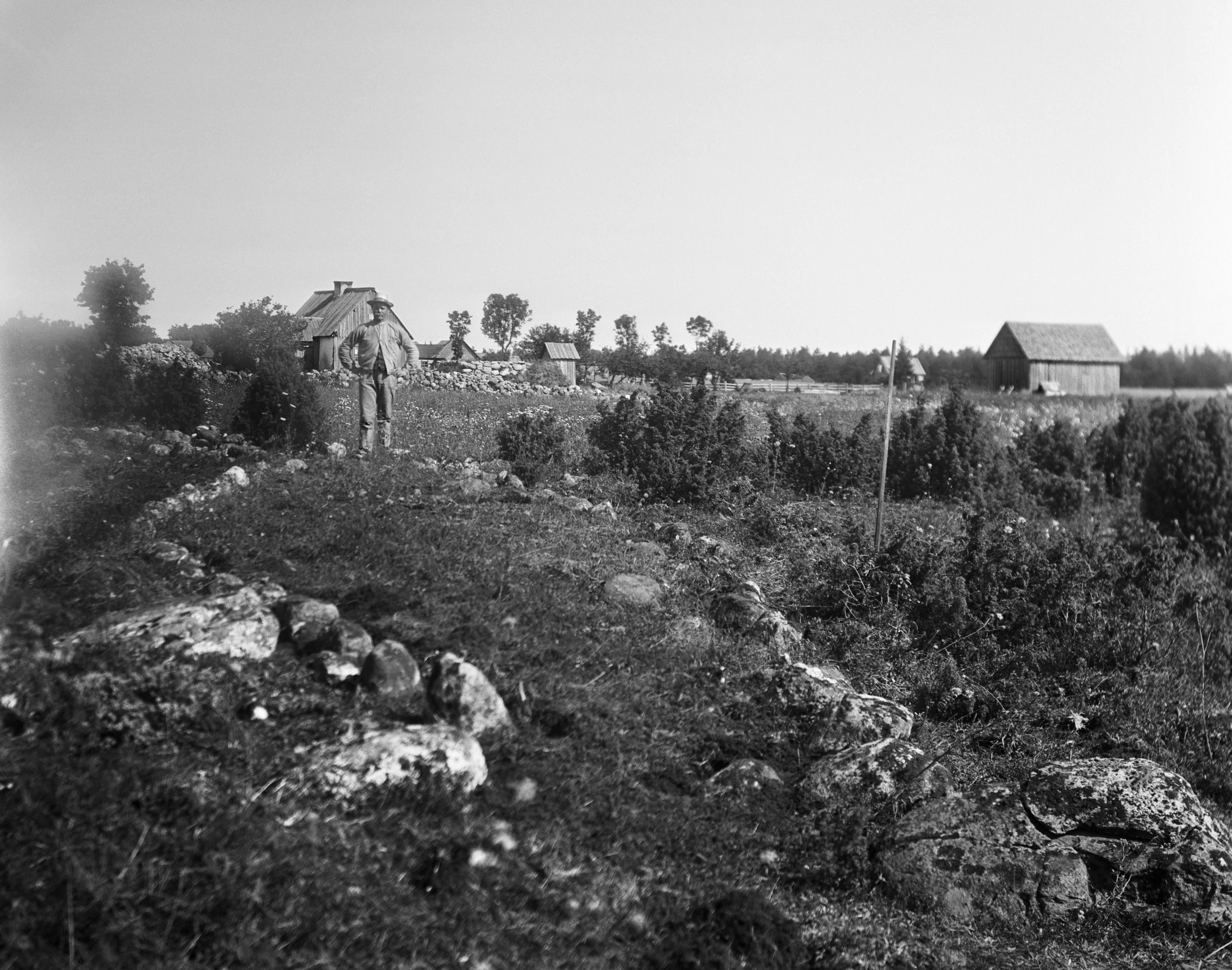 RAÄ-nummer Lärbro 114:1. Skeppssättning på gravfält i Tängelgårda (Tängelgårde). Undersökt 1915 av Bror Schnittger. I bakgrunden en gård.