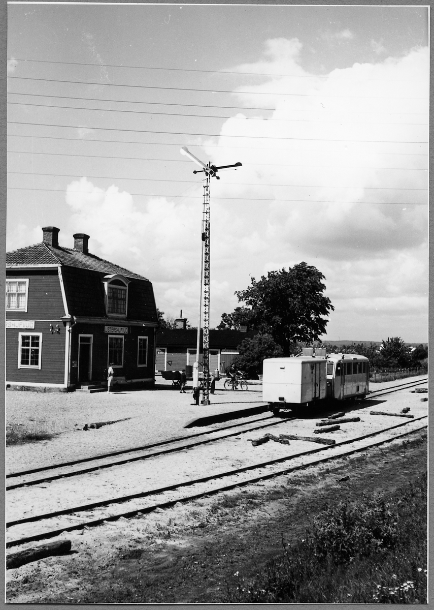 Titel: Motorvagn med släp på Blekinge Kustbanor passerar Listershuvuds Järnvägsstation.