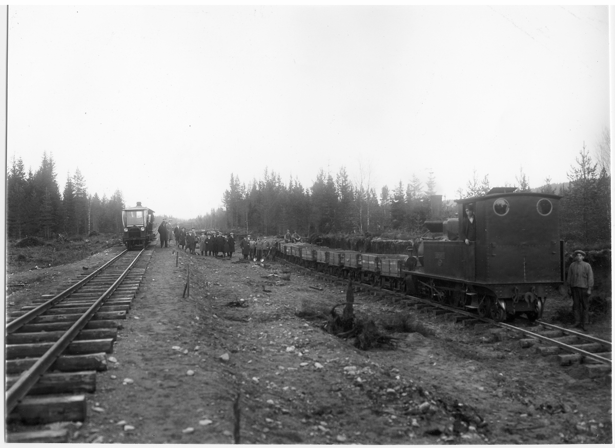 Från byggandet av järnvägslinjen Hällefors - Gravendal. På linjen mellan Hällefors - Gravendal. Sävsnäs Järnväg, SVJ lok 2 "Fredriksberg", SVJ motorvagn 1.