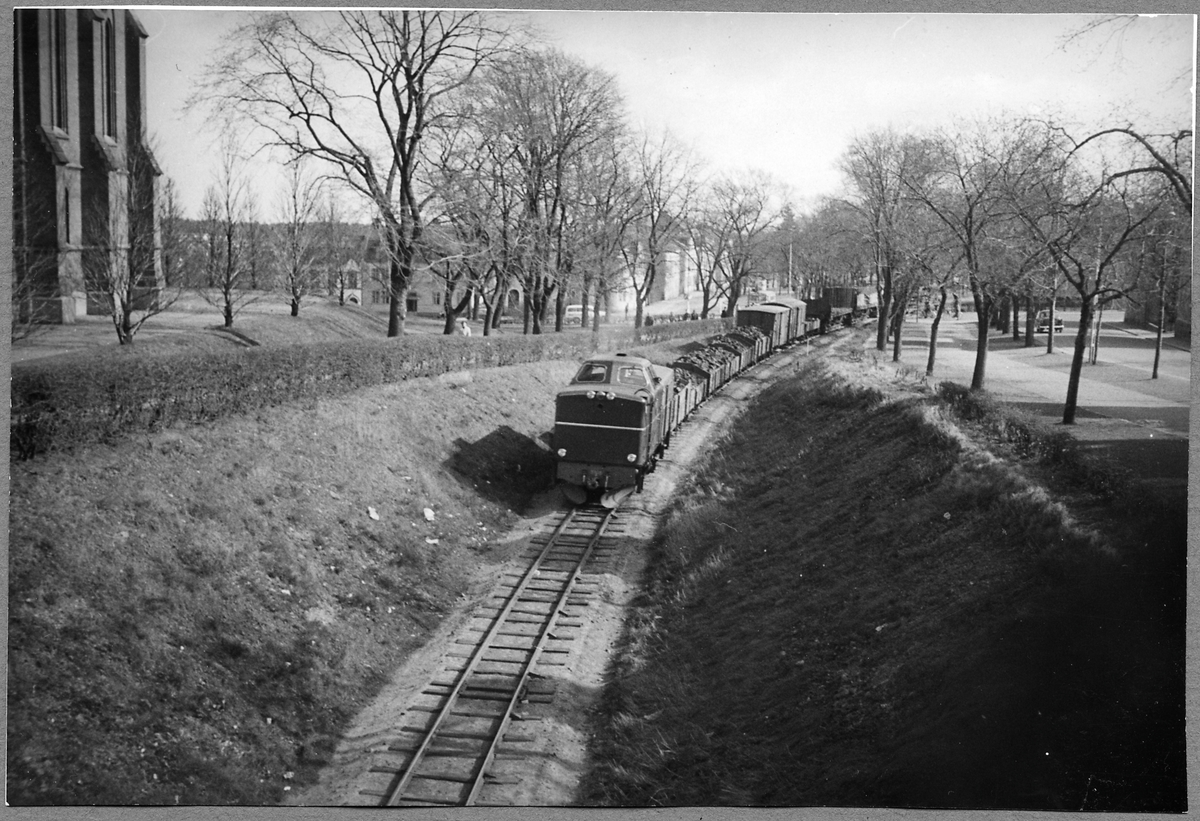 Statens Järnvägar, SJ Tp 3516 med godståg passerar kyrkan i Västervik.