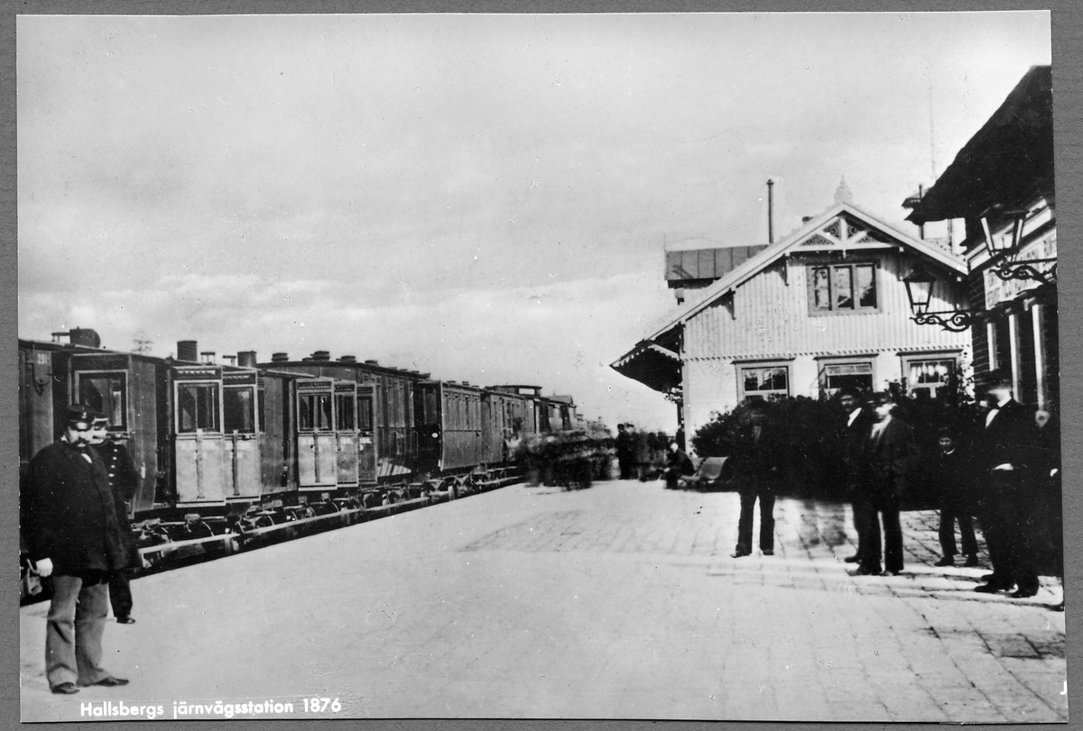 Järnvägsstationen i Hallsberg med ett tidsenligt järnvägståg där personvagnarna hade olika typer av sidodörrar.