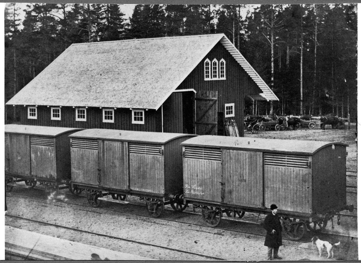 Titel: Godsvagnar uppställda vid godsmagasinet i Hallsberg.
