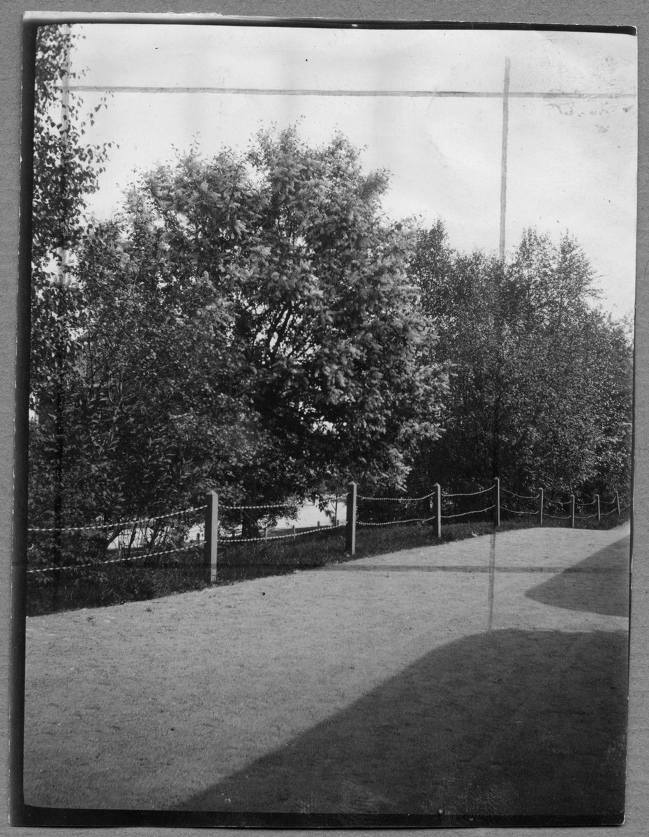 Titel: Del av trädgården vid Anundsjö station. Blommande hägg