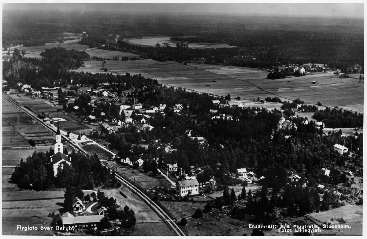 Vy över Bergby med järnvägsstation och kyrkan. Del av Ostkustbanan, OKB.