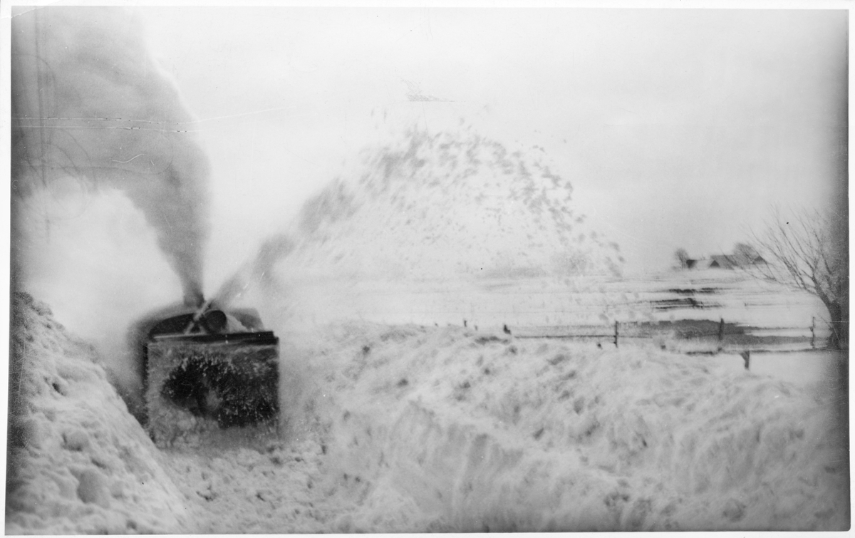 Titel: 31 mars 1942 vid Blästorp. Ångdriven snöslungan i arbete.