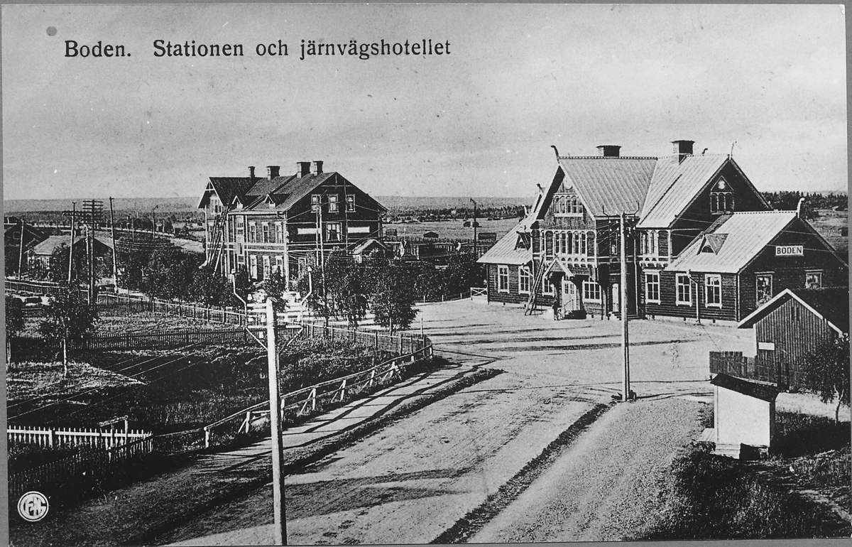 Kopia av vykort. Boden, stationen och hotellet sett från gatusidan.