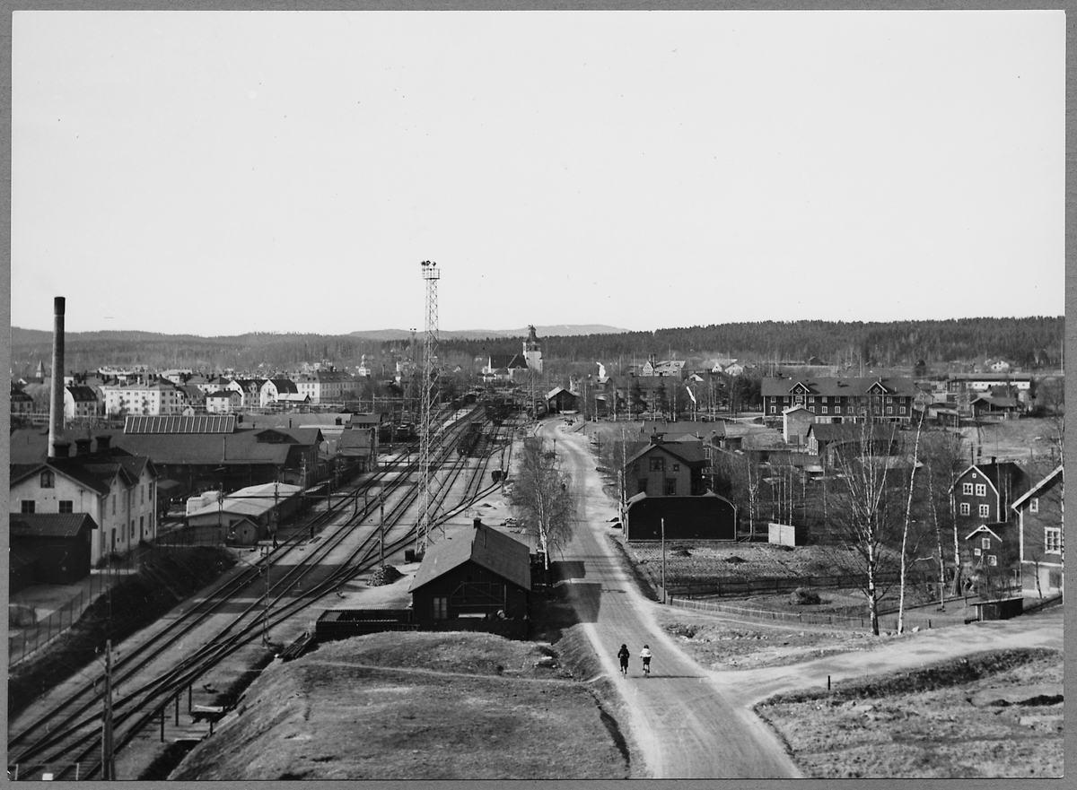 Titel: Vy över bangården med kyrkan i Bollnäs i bakgrunden.