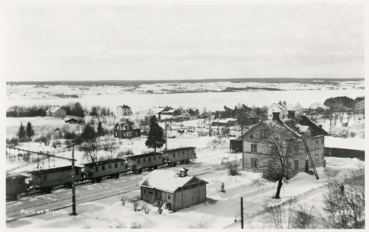 Titel: Parti av Brunflo med gamla stationshuset omkring år 1950.