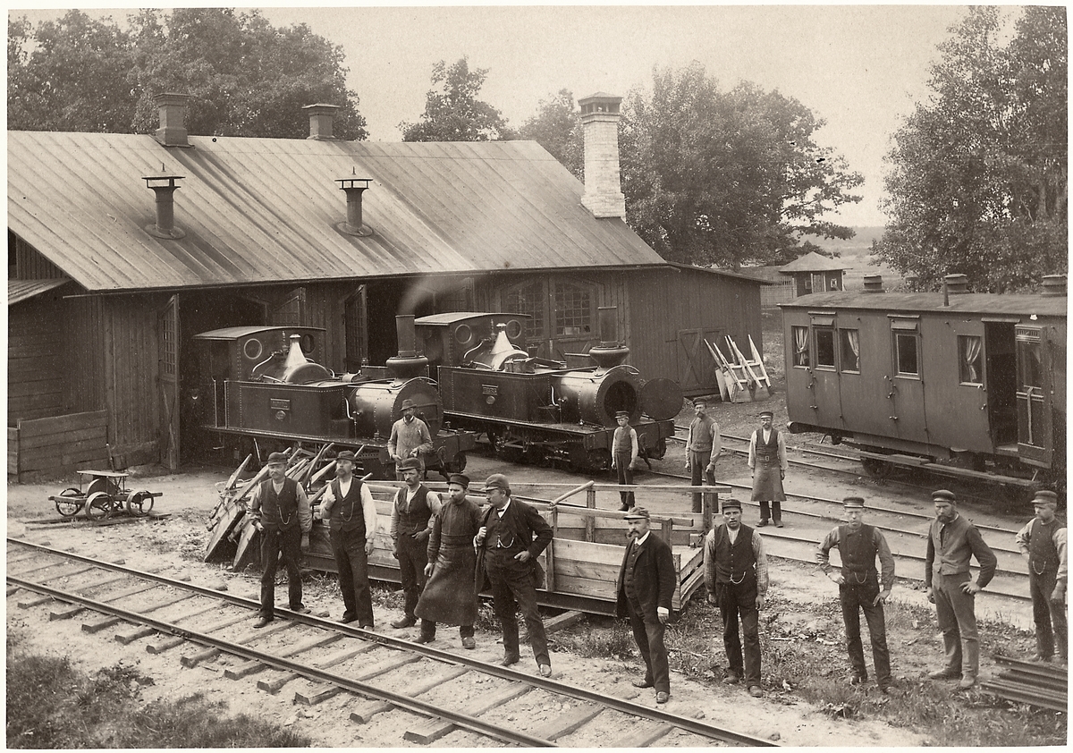 Lokstallarna i Dannemora. Foto i trafikkchefsskrift 1885. DHJ lok 1 "HARG", DHJ lok 3 "Ramhäll"