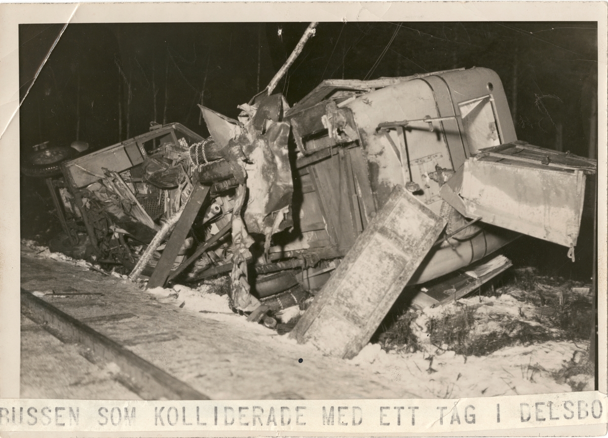 Titel: Bussen som kolliderade med ett tåg i Delsbo 1933-03-14