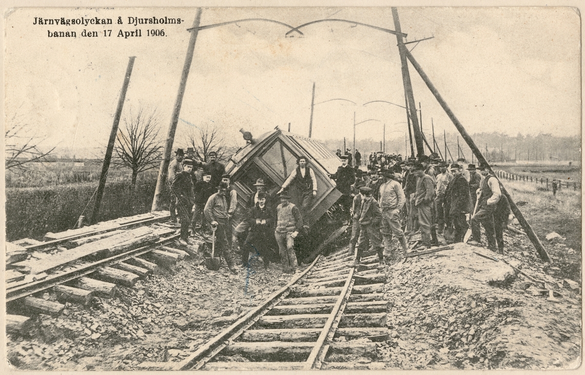 Titel: Järnvägsolycka å Djursholmsbanan den 17 april 1906. Strax söder om Frescati hållplats.