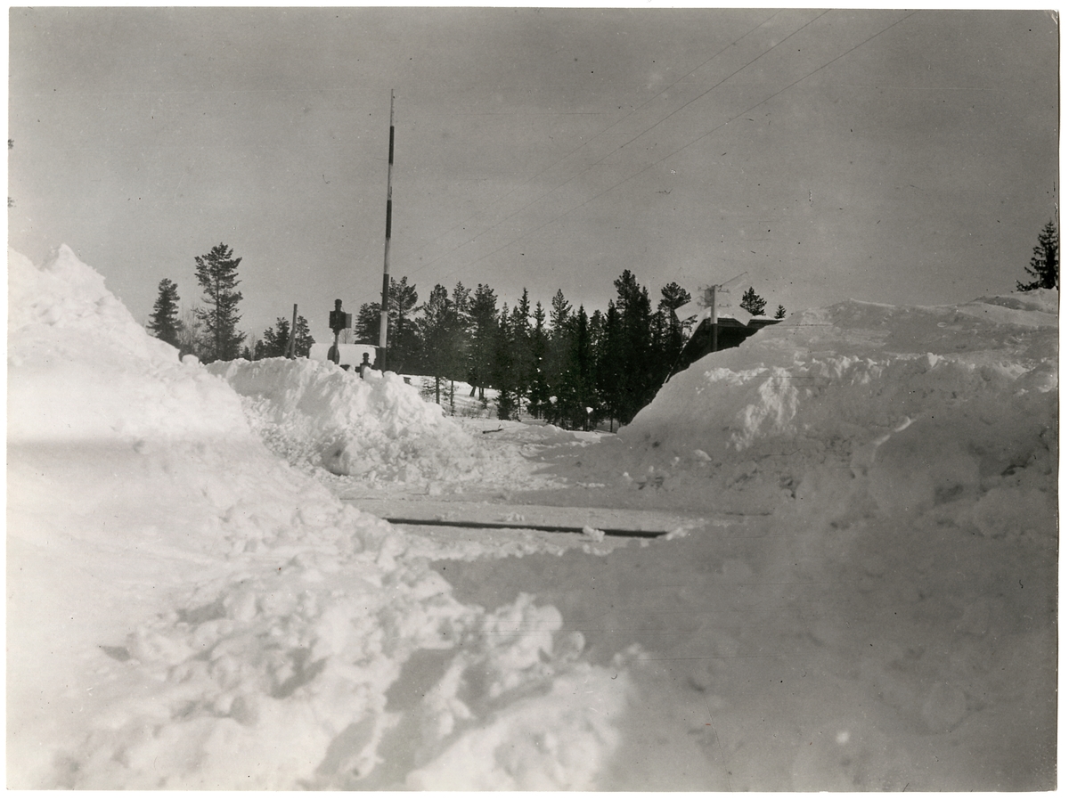 Emådalen på linjen Orsa-Sveg taget i Febuari 1931. En av de blockerade vägövergång som blivit svårtrafikerad genom snövallarna