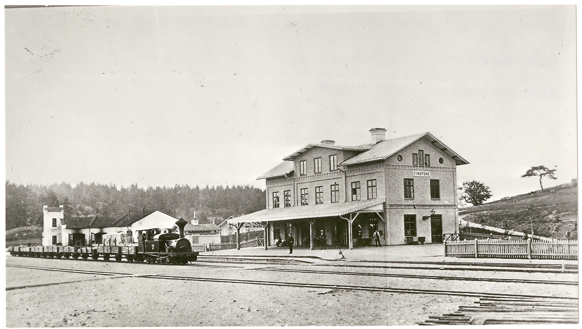 Titel: Finspång järnvägsstation med lokomotivet Lotorp och ett tågsätt på bangården år 1880.