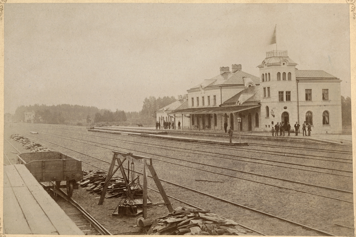 Titel: Frövi 1874 station och bangård med järnvåg.