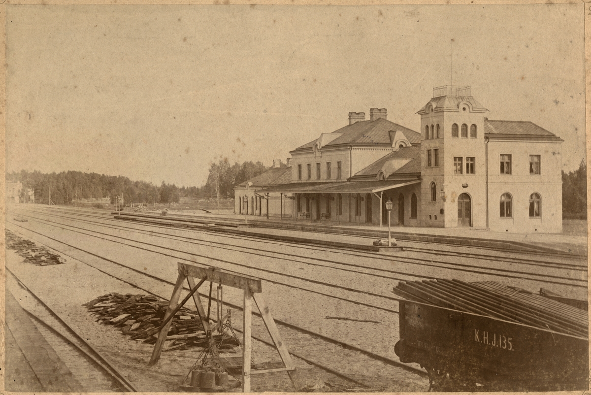 Titel: Frövi 1874 station och bangård med godsvagn från Köping - Hults Järnväg KHJ 135
