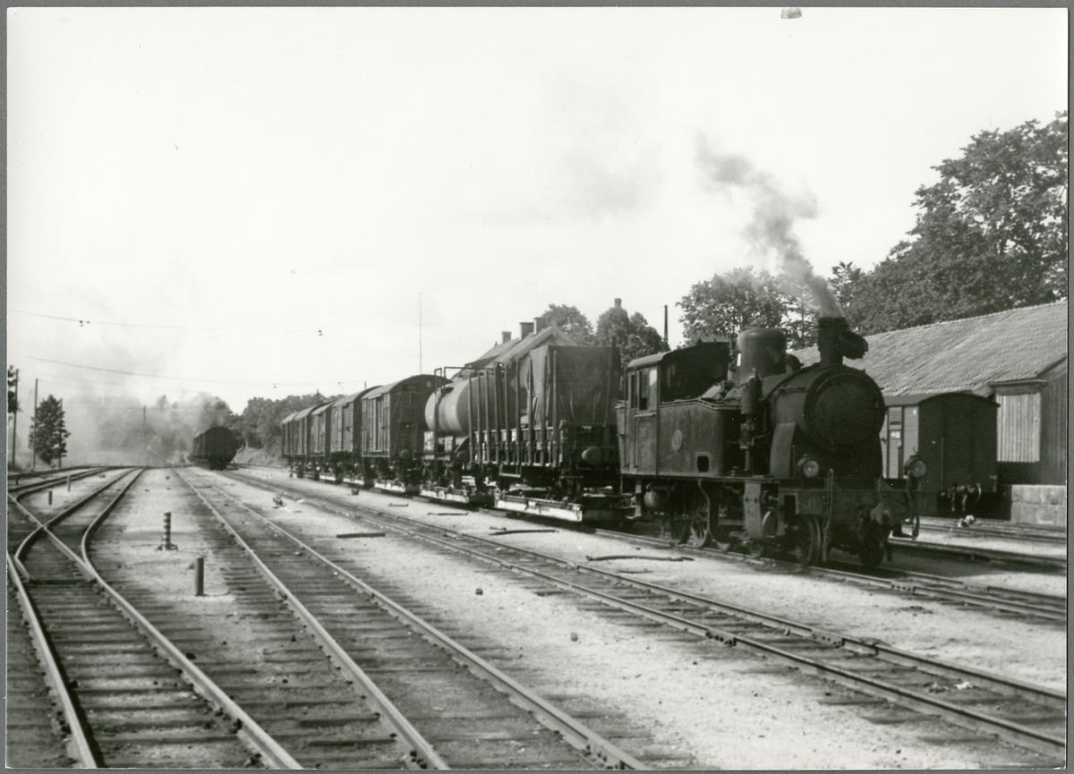 Ånglok, .Dannemora - Hargs Järnväg, DHJ Lok 11 vid Gimo station. Transport till Rockwool. Loket utrustat med elektrisk belysning vilket gjordes av Österby-verkstaden mellan 1941 och 1946.