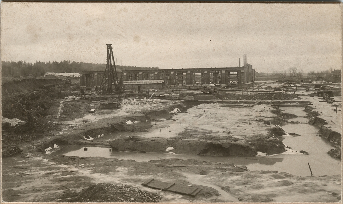 Gefle verkstadsbyggnader under uppbyggnad vid Gävle år 1903. Gävle - Dala Järnväg, GDJ.