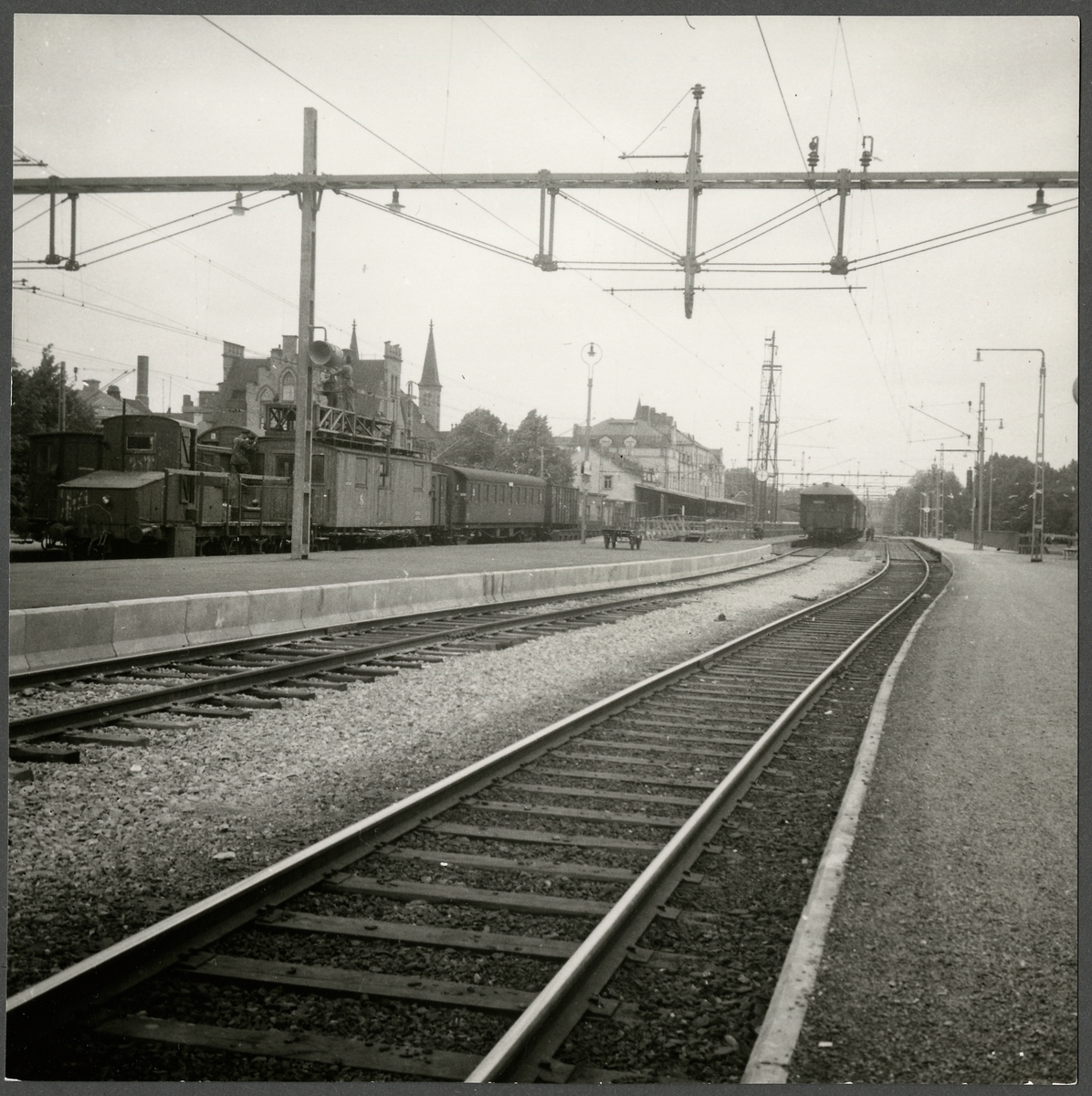 Titel: Vy över Gävle Station. Gods och personvagnståg står på spåret intill stationshuset.