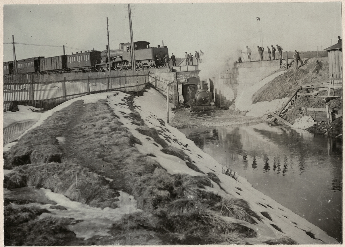 Gävle Dala Järnväg, GDJ korsar Gävle - Ockelbo Järnväg, GOJ. Tåget under viadukten är ett ankommande tåg från Ockelbo.
