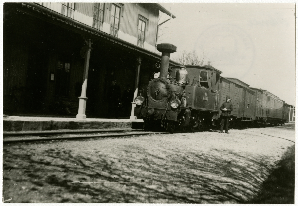 Hjo-Stentorps Järnväg, HSJ 6 "Gösta Posse"med tåg. Loket tillverkades 1892, skrotades 1946.