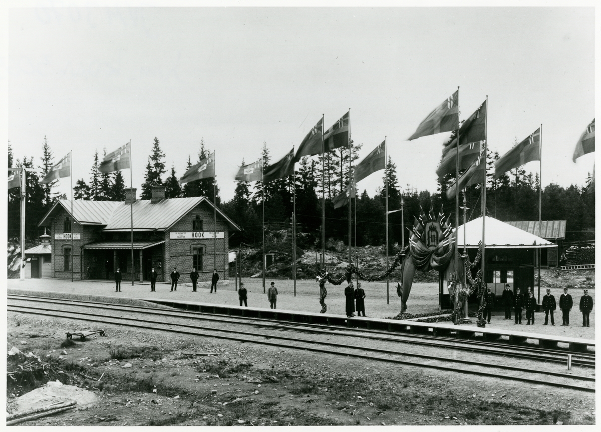 Station anlagd 1880. Unionsflaggorna är hissade inför Oscar II och drottning Sofias besök på Hooks herrgård.
