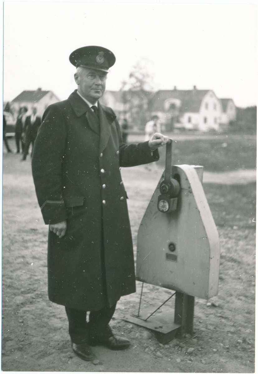 Falkenbergs Järnväg, FJ Knt O. A. Andersson vid bomspelet vid tåg 158 (näst sista) på Holsljunga station. Nedlagd av bandelen Älvsered-Axelfors_Hillared. 1961-05-01.