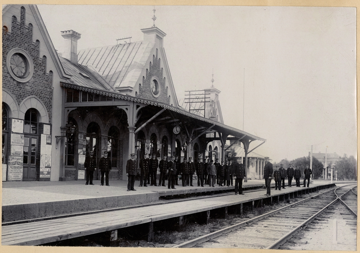 Personalbild. Envånings stationshus i sten, rappat och putsat. Stationen ombyggd 1924. Godsmagasinet rivet 1995.