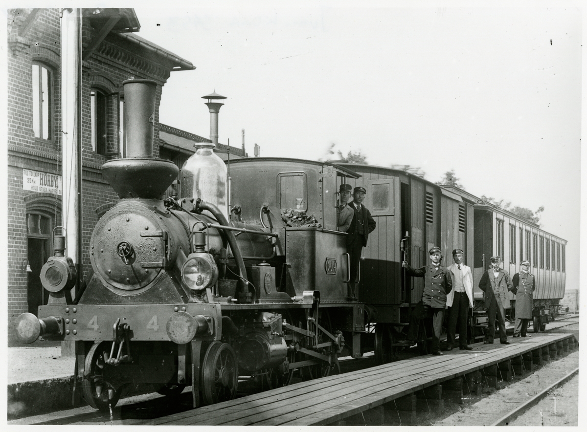 GJ 4 ånglok på stationen. Ursprungligen HKJ 4, Hästveda Karpalunds järnväg. Personal poserar på plattformen. framför tåget.