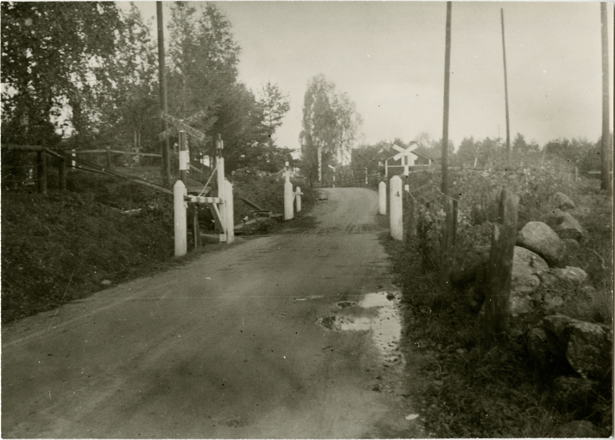 Text på baksidan av fotot "Vägövergång vid Sunnerstaholm på linjen Bollnäs Freluga juli 1934, som slopades när nya vägporten blev färdig."