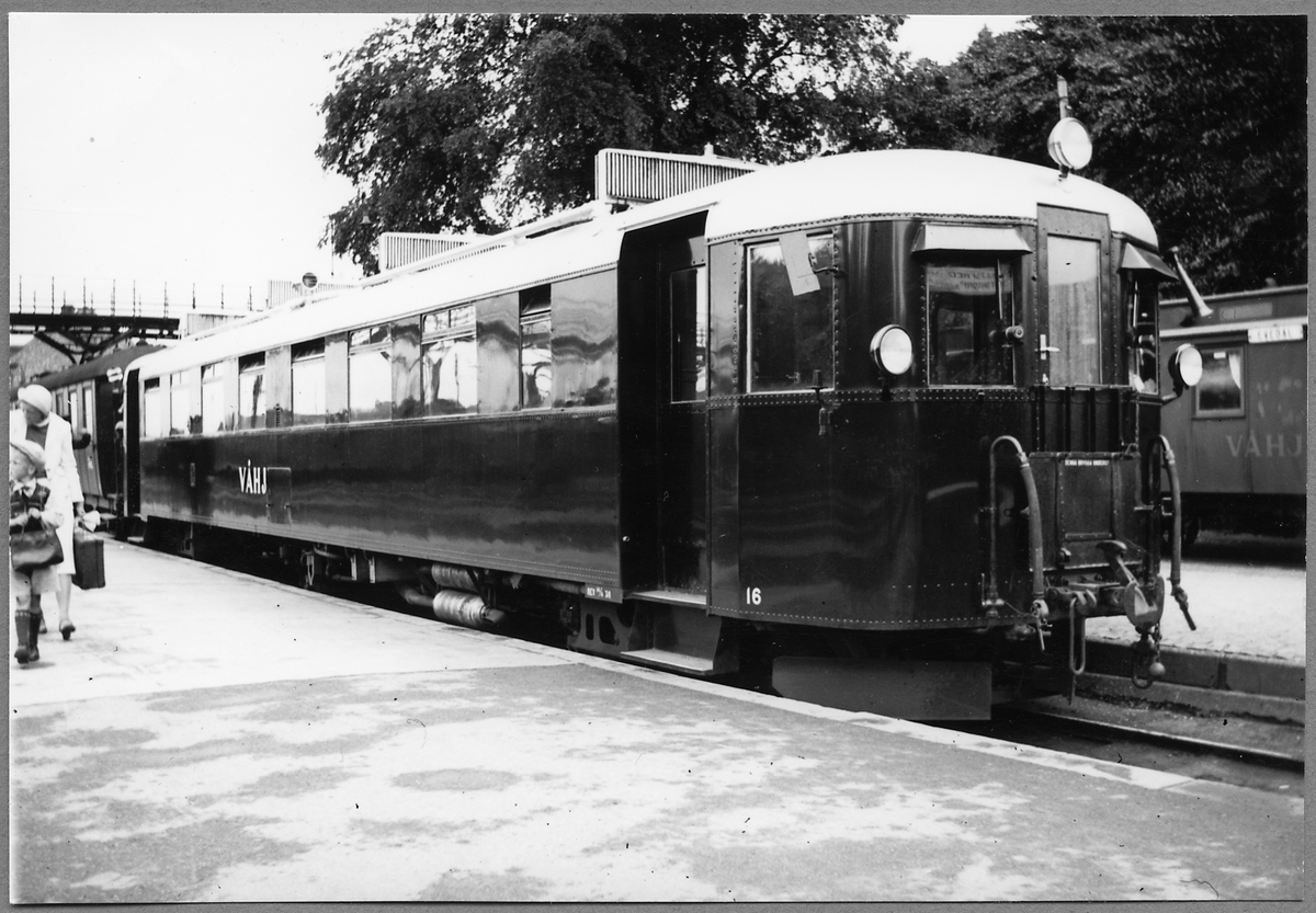 Växjö Åseda Hultsfred Järnväg, VÅHJ XCo 16 i Växjö. Längst till höger skymtar en personvagn tillhörande VÅHJ, på vars skylt står att läsa Evedal.