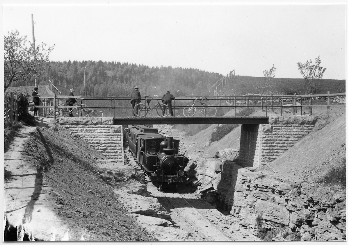 Skövde-Axvalls Järnväg, SAJ lok 2 med persontåg passerar viadukten vid Våmb.