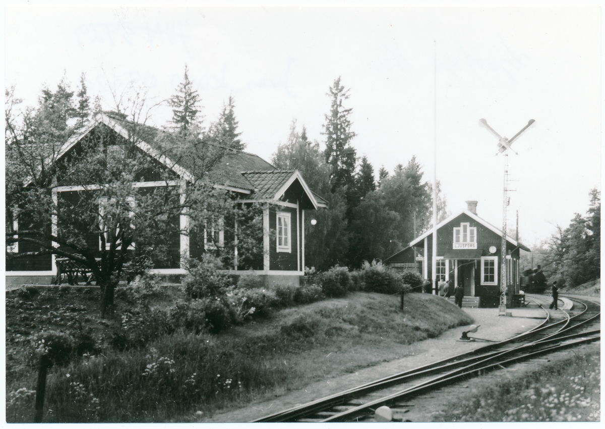 Titel: Ljusfors station med ankommande tåg. Stationen togs i bruk 1885.