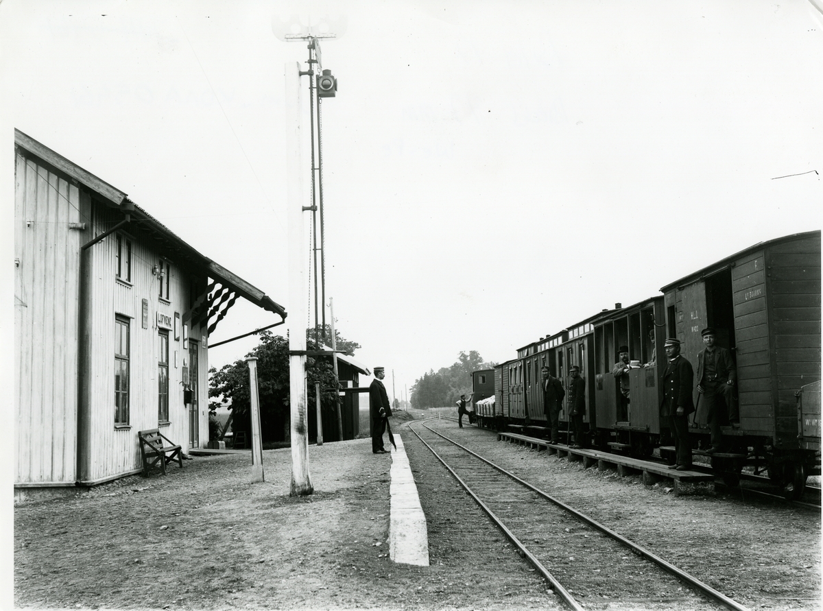 Titel: Trafikplats anlagd 1877. En- och enhalvvånings stationshus i trä . Lofvene