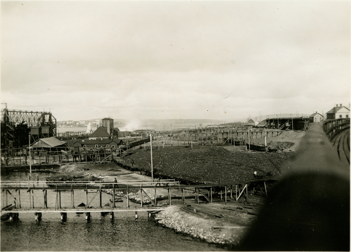 Malmlastningsbryggor och anordningar ute vid hamnen, elevatorn till vänster