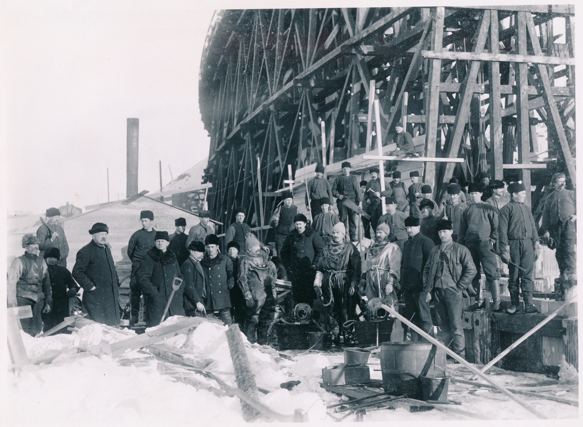 Titel: Malmviadukterna byggs om på Svartån invid Luleå station. Vintern 1906-1907. Dykararbete.