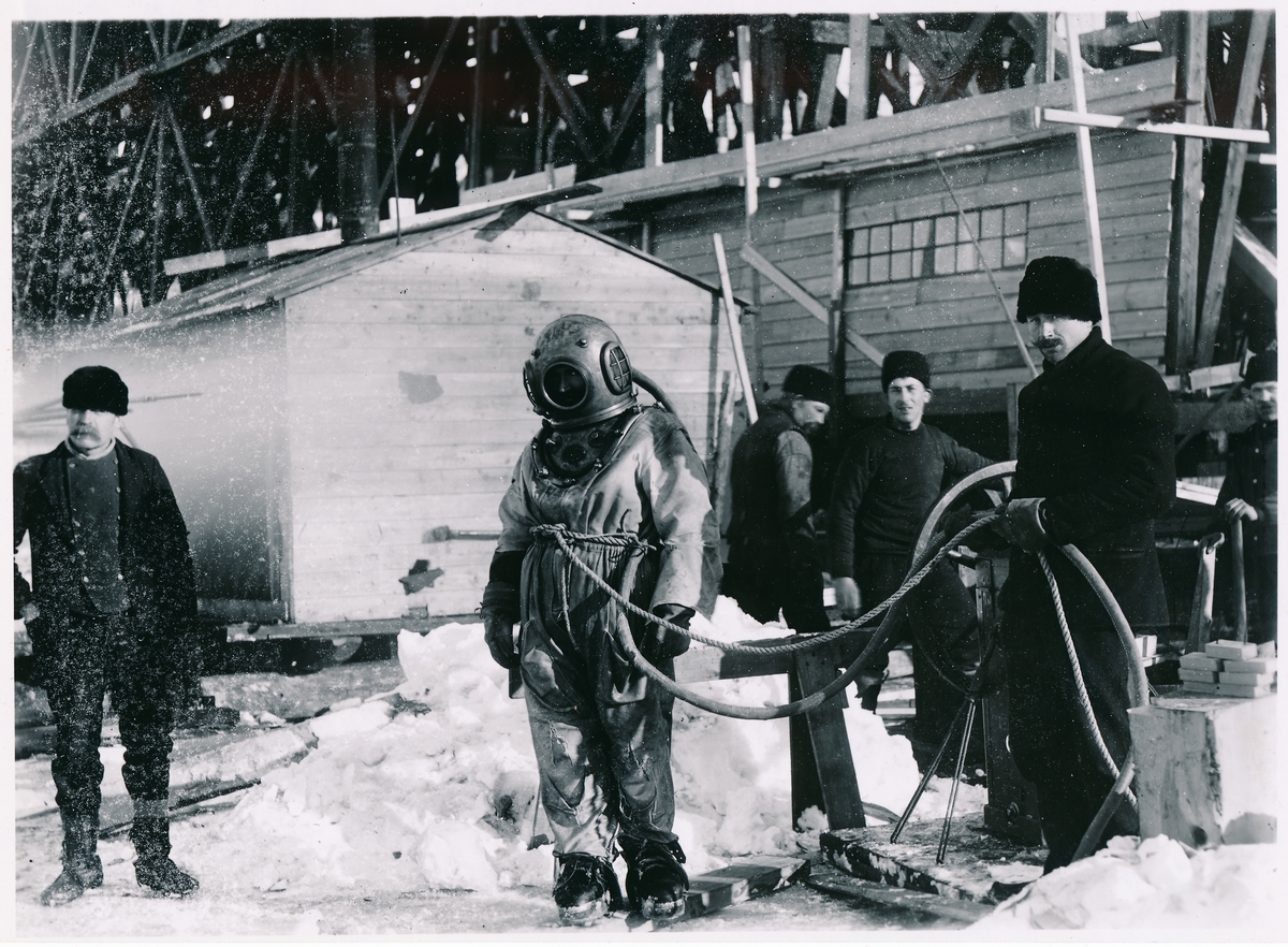 Titel: Malmviadukterna byggs om på Svartån invid Luleå station. Vintern 1906-1907. Dykararbete.